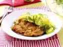 Drain the peaches and collect the juice. Form small balls from the ground pork with moistened hands. Peel and chop the onions. Wash the chicken fillets, dab dry and also dice them