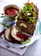 For the filling peel 1 onion and chop finely. Dice the bacon and fry it crisply in a pan without fat. Fry the diced onion. Let cool off. Dice the bread roll. Chop half dried fruit roughly. Whisk egg and milk. With bread roll, bacon mix,