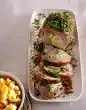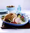 Turn the oven on (electric oven: 225 °C/recirculating air: 200 °C/gas: see manufacturer). Mix cinnamon, honey and 1 tsp. salt. Spread the turkey for the last 10 minutes. Carve the turkey. Cut open the turkey carcass and remove the filling. Season vegetables with salt and pepper. Arrange everything