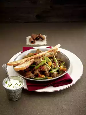 Peel and finely dice the onions and garlic. Wash and clean the chilli and cut into thin rings. Wash the meat, dab dry and cut into cubes. Heat 2 tablespoons of oil in a frying pan and fry the meat in portions for about 4 minutes, turning. Add onion and garlic cubes and fry for approx. 4 minutes. Deglaze with stock, bring to the boil and simmer for about 1 1/2 hours. Season with salt, pepper, turmeric, cumin and cinnamon