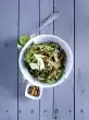 Meanwhile bring 250 ml water, turmeric and a little salt to the boil and remove from the heat. Stir in couscous and let it swell for 2 minutes. Add butter and loosen couscous with a fork. Wash the mint, shake dry and cut the leaves into strips.