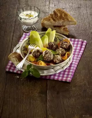 Arrange all salad ingredients on plates. Place balls on top and drizzle with salad dressing. Add the rest of the sauce. Flatbread tastes good with it