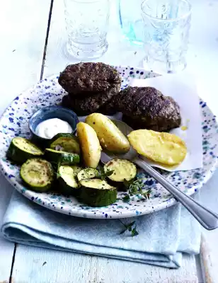 Arrange meatballs, potatoes and courgettes. Crème fraîche tastes good with it.