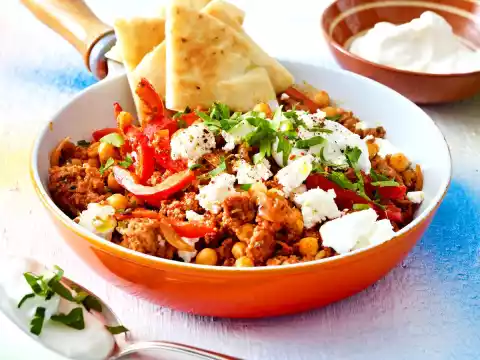 Add the chick peas to the minced meat, stir in and heat for approx. 3 minutes. Crumble the feta coarsely. Season the mincing pan with salt, pepper and cumin and sprinkle with feta and parsley. Greek yoghurt and pita bread taste good with it.