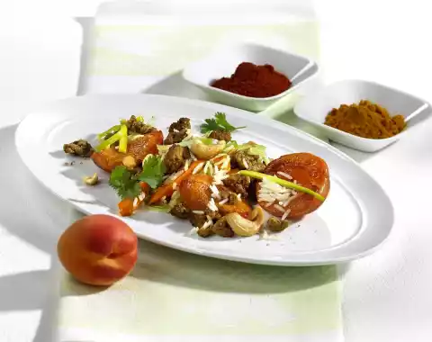 Fry the minced meat in oil until crumbly. Season with salt, cinnamon, curry and cayenne pepper. Add leek and carrots, fry briefly. Add orange juice and simmer for about 8 minutes. Add apricot slices 3 minutes before the end of cooking time.