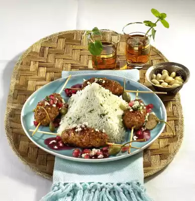 Form 8 longish meatballs with wet hands and put them on wooden skewers. Heat oil in a pan and fry meatball skewers for 6-7 minutes until golden brown. Wash coriander, dab dry, pluck leaves from the stalks and chop coarsely. Mix coriander and rice. If necessary, place in a greased pyramid dish, press firmly and turn out onto a plate. Place the meatball skewers on the plate. Sprinkle with pomegranate mixture and garnish with capers if desired