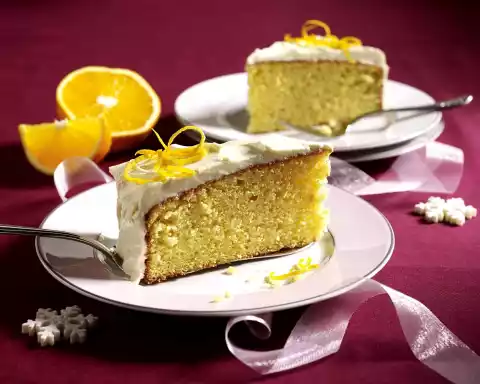 Mix flour, baking powder, almonds, half of the grated orange peel, mace and cloves and stir in. Fill the dough into a greased springform pan (26 cm Ø), dust with flour and smooth it down. Bake in the preheated oven (electric cooker: 175 °C/ convection oven: 150 °C/ gas: level 2) for 45-55 minutes (test with sticks). Remove the cake from the edge and let it cool down on a cake rack. Finely chop half of the orange zests. Stir cream cheese, orange liqueur, icing sugar and chopped orange zest until smooth and coat the cold cake all around. Refrigerate the cake again for about 30 minutes and decorate with the remaining orange zests before serving