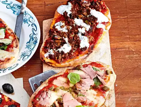 manufacturer). Line baking tray with baking paper. Cover breads with pizza sauce and minced meat. Bake on the baking tray in the oven for 8-10 minutes. Wash mint and chop finely. Mix with yoghurt, season with salt and serve.
