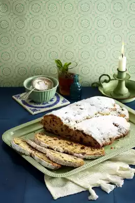 Melt the remaining fat. Take the stollen out of the oven. Immediately spread some of the melted fat on the stollen and dust with icing sugar. Repeat the process several times.