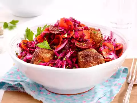 Fry the meatballs for approx. 5 minutes while turning, remove from the pan and drain on kitchen paper. Arrange red cabbage salad and meatballs in bowls. Garnish with the remaining parsley.