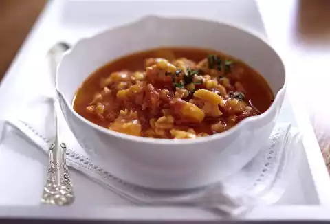 Add the lentils and chilli to the vegetables and steam for about 2 minutes. Add tomatoes together with juice and 400 ml water. Chop the tomatoes slightly. Bring everything to the boil and simmer for about 10 minutes.