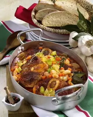 Place leg slices in the sauce. Braise in the preheated oven (electric cooker: 200 °C/ convection oven: 175 °C/ gas: level 3) for about 1 1/2 hours. Stir from time to time. Drain the beans and heat them up. Season again and serve garnished with fresh thyme.