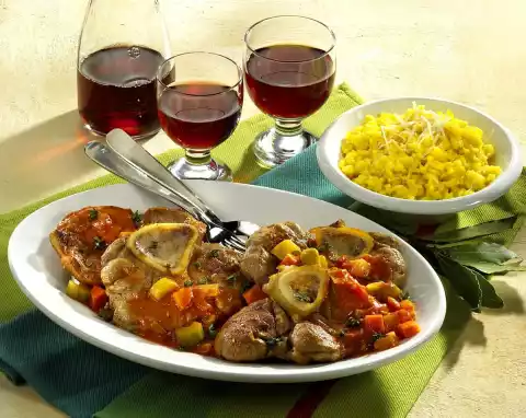 Heat 3 tablespoons of oil in a roaster. Fry the veal knuckle slices on both sides and remove. Put diced onion and half of the garlic in the roaster and steam. Add the carrots, celery and leek and fry. Stir in tomato paste and add 500 ml white wine. Add the tomatoes, bay leaf and 4 stalks of thyme. Season with salt and pepper. Add veal shank slices to the sauce and braise in the preheated oven (electric cooker: 200 °C/ convection oven: 175 °C/ gas: level 3) covered for about 1 1/2 hours. Finely dice the remaining onion. Heat 1 tablespoon of oil in a saucepan and sauté the onion for approx. 5 minutes at medium heat. Add the rice and saffron and fry. Deglaze with 150 ml white wine.