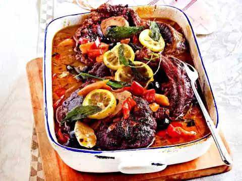Wash leg slices, dab dry, season with salt and pepper and turn in flour, tap off. Heat 2 tablespoons of oil in a large frying pan. Fry the leg slices on all sides, season with salt and pepper and remove. Fry the carrots, peppers, onions and garlic in the frying fat. Add bay leaf and leg slices and deglaze everything with stock and white wine. Season with salt and pepper, bring to the boil once. Cover and bake in a preheated oven (electric cooker: 200 °C/ convection oven: 175 °C/ gas: see manufacturer) for about 2 hours.