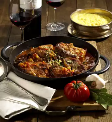 Add 1/8 l of wine, veal stock, tomatoes with juice, thyme, oregano, bay leaf, salt and pepper. Cover and braise in the preheated oven (electric cooker: 200 °C/ convection oven: 175 °C/ gas: level 3) for about 2 hours.