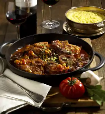 Fry the vegetables, onion and garlic cubes in the frying fat. Add 1/8 l wine, stock, tomatoes with juice, thyme, oregano, bay leaf, salt and pepper. Coarsely chop the tomatoes. Add meat again. Cover and braise in the preheated oven (electric cooker: 200 °C/circulating air: 175 °C/gas: level 3) for approx. 2 hours
