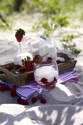 Let cool down. Spread vanilla cream on the mousse. Wash the mint, shake dry. Wash 150 g strawberries, dab dry. Put on skewers with ##mint##. Decorate glasses with it