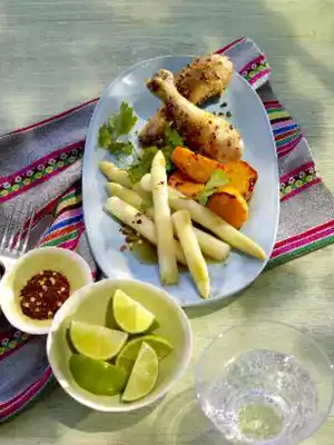 Cut the lime into slices. Pluck coriander leaves from stalks. Sprinkle asparagus, chicken and sweet potatoes with chilli flakes and coriander. Serve with slices of lime.