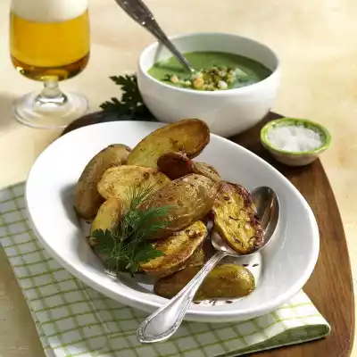 Season the sauce with salt, pepper and sugar. Pour the sauce into a bowl. Cut half the egg into cubes and sprinkle the remaining herbs over the sauce. Arrange potatoes on a plate and garnish with parsley and dill.