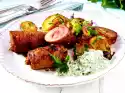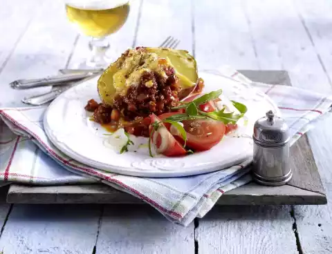Sprinkle with cheese and gratinate under the grill for about 5 minutes. Arrange 2 potato halves and salad on plates.