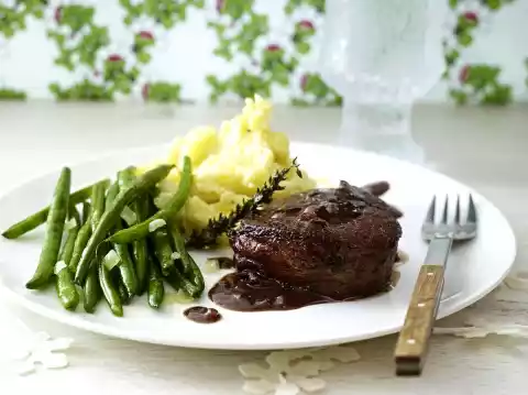 Wash the meat, dab dry and season with salt. Wrap each with a slice of bacon. Heat the oil in an ovenproof pan and fry the meat on each side for about 2 minutes. Add thyme for the last 2 minutes. Season meat with pepper. Remove meat from the pan. Roast the tomato paste in the frying fat while stirring. Dust with flour. Deglaze with red wine and stock, bring to the boil while stirring and simmer for about 2 minutes. Put the fillets back into the sauce and braise in the preheated oven (electric cooker: 150 °C/ convection oven: 125 °C/ gas: level 1) for about 10 minutes
