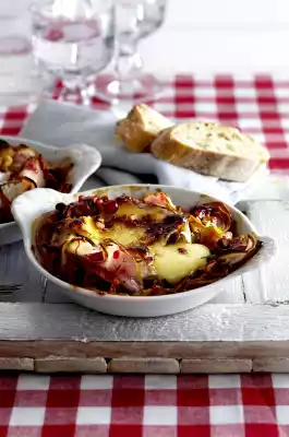 Bake in a hot oven for about 12 minutes. Then cut the surface of the camemberts crosswise with a sharp knife. Fold the corners carefully outwards. Continue baking at the same temperature for 8-10 minutes.