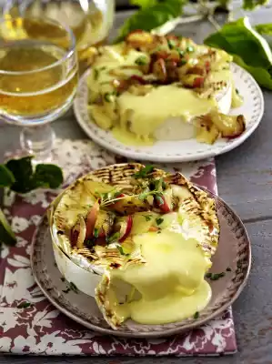 Take the cheese out of the oven, spread the onion and apple mixture on top. Baguette tastes good with it.