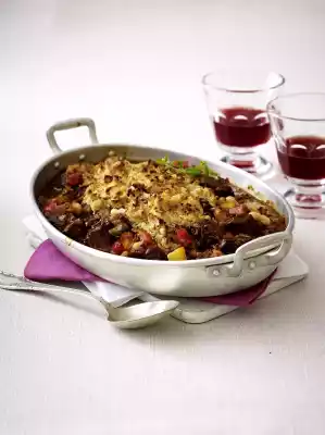 Stir the vegetables and beans into the goulash about 30 minutes before the end of the cooking time. Spread the bread mixture in flakes over the goulash and bake to finish. Take out the goulash, let it cool down a bit and garnish with marjoram