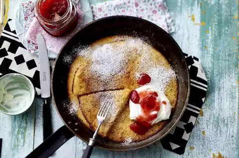 Fold in melted butter last. Melt 1 tablespoon of butter in an ovenproof pan (approx. 28 cm Ø). Add half of the dough. In a preheated oven (electric cooker: 225 °C/ convection oven: 200 °C/ gas: see