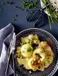 Remove the roaster from the oven. Add 100 g crème fraiche. Puree everything finely, season to taste with salt, pepper and 3 tbsp. lemon juice. Pluck the black pudding into large pieces. Serve the soup with 100 g crème fraîche, apple chips, sausage, parsley and ground pepper