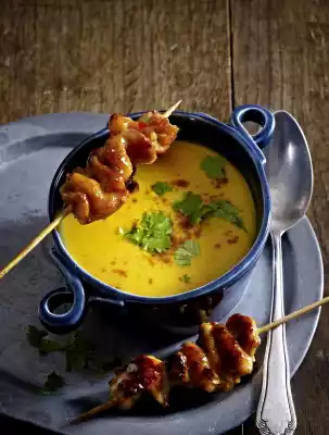 Remove the roaster from the oven. Add coconut milk and curry. Puree everything finely, season with salt and pepper. Arrange in bowls and serve garnished with curry powder and coriander. Add skewers