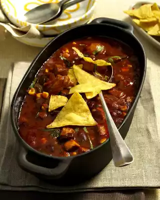 Season with salt, pepper and cayenne pepper. Cover and cook in the preheated oven (electric cooker: 175 °C/ convection oven: 150 °C/ gas: level 2) for about 1 3/4 hours. Season oven soup with salt, paprika and possibly cayenne pepper. Wash parsley, dab dry and cut into strips. Sprinkle soup with it. Serve with tacos and sour cream