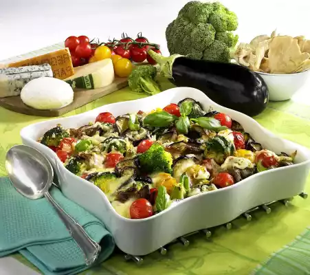 Place the vegetables and basil strips in a large casserole dish and mix well. Cut the mozzarella into slices, then cut in half again. Grate Parmesan and Bel Paeso. Cut gorgonzola into small pieces.