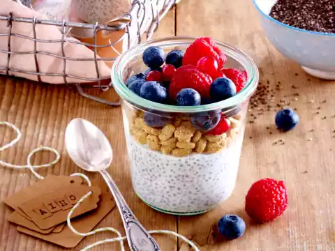 The day before, peel the banana, cut it into large pieces and mash it with a fork. Mix banana puree with almond milk. Stir in yoghurt and chia seeds, fill into glasses and chill overnight