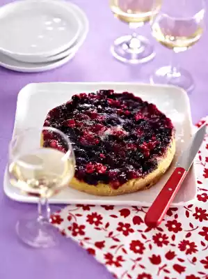 Melt the fat. Beat the eggs, vanillin sugar and 100 g sugar until light creamy. Mix flour and baking powder and fold in alternately with the fat. Pour the dough over the fruits and bake in a preheated oven (electric cooker: 175 °C/ convection oven: 150 °C/ gas: see manufacturer) for 20-25 minutes