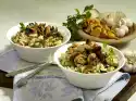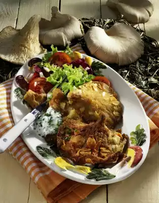 Heat 2-4 tablespoons of oil in a coated frying pan. Fry the mushrooms for 3-4 minutes on each side in portions. Drain on kitchen paper. Mix salads, tomatoes and marinade. Serve everything