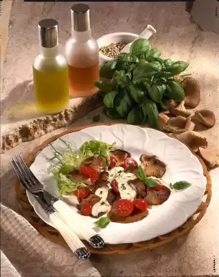 Clean the mushrooms, rub them, possibly halve them. Peel and chop the shallots or onion. Wash, clean and halve the tomatoes. Wash lettuce leaves, shake dry and pluck into pieces. Wash basil and cut finely, except for a few leaves for garnishing