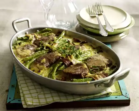 Heat 1 tablespoon of oil in a frying pan, fry the parcels all around, remove. Put meat and beans alternately in a large casserole dish, pour thyme sauce over them and sprinkle with cheese.