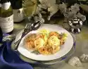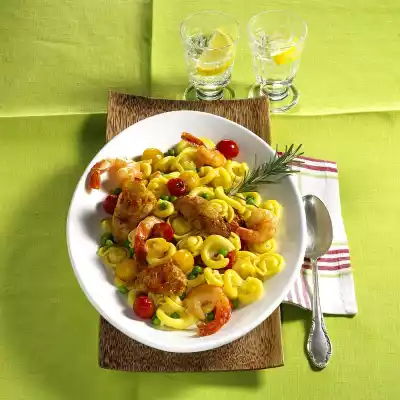 Remove the chicken from the oven and remove from the bone. Heat oil in a large pan, fry prawns on each side for about 1 minute, season with salt and pepper. Add tomatoes, peas and meat and fry for about 1 minute more. Drain the noodles, drain and fold in. Season to taste with salt, pepper and saffron. Arrange in a bowl garnished with rosemary