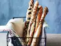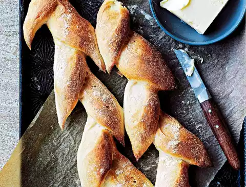 For the Pains d Epi, cut the dough into quarters and roll into 20cm long sticks on a floured work surface. For the baguettes, divide the dough into thirds and roll into 30cm long sticks. Place on a baking tray lined with baking paper.