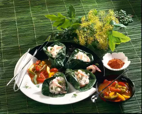 Rinse the crabs briefly, drain them and fold them into the rice with the plucked coriander. Place one tablespoon of rice on each paksoi leaf. Fold the vegetables into a bag. Arrange on a plate.
