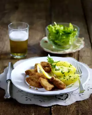 Whisk vinegar, salt, pepper, sugar and shallot. Add 3 tablespoons of oil drop by drop. Wash cutlets, dab dry and cut into pieces. Beat the eggs and season well with salt and pepper.