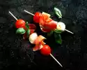 Puree the tomatoes and garlic. Cut the ham in half lengthwise. Wash and drain the anchovies. Stone and roughly chop the olives. Slice cheese. Cut bread into strips about 3 cm wide and spread with tomato paste.