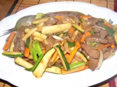 Add 1 tablespoon of oil to the wok. Stir the spring onion, garlic, carrots and courgettes briefly in it. Add the spice mixture and bring to the boil briefly. Mix in the beef and serve immediately.