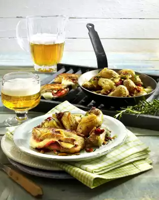 Roast the pine nuts in a small pan without oil until golden brown and take them out immediately. Season the finished roast potatoes with salt and pepper again and sprinkle with pine nuts. Serve pizza cutlets with it.