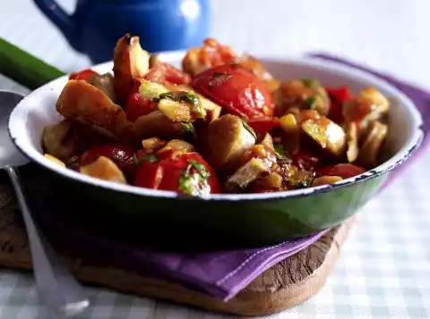 After about 2 minutes add the tomatoes. Season to taste with salt, pepper, sugar and vinegar. Wash basil, shake dry, pluck leaves from the stalks and cut into strips. Add sausage, bread and basil to the pan and fold in.