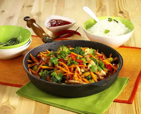 Add vegetables and chilli and fry. Season with chili sauce. Wash the coriander, shake dry and pluck the leaves from the stalks. Add coriander to the vegetables and fold in. Serve the rice with the vegetables.