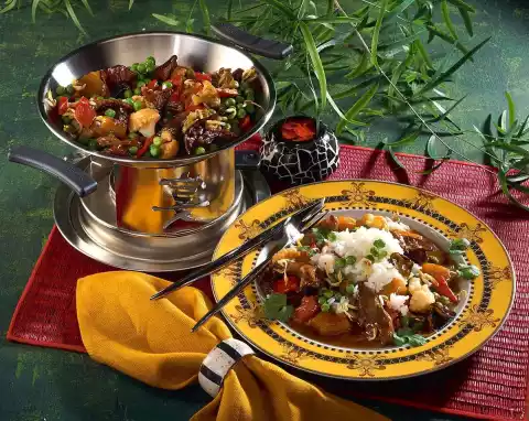 Cut the duck breast into thin slices, fry briefly while turning, season with salt and pepper. Add the pan-fried vegetables and pineapple pieces and fry for approx. 4 minutes. Deglaze with stock and pineapple juice and cook for about 5 minutes.