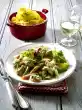 Add 150 ml water, bring to the boil and stir in the stock. Season vegetables with soy sauce and pepper. Add meat again and heat up. Serve everything.
