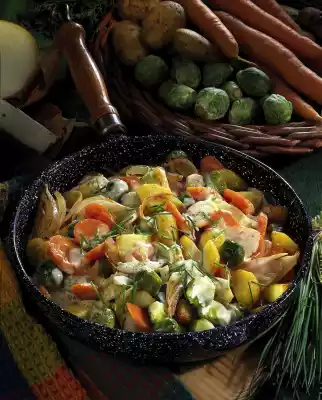 Clean and wash the Brussels sprouts. Cut the stalk crosswise. Cook in boiling salt water for about 10 minutes. Peel and wash potatoes and carrots and cut into small pieces. Peel and slice the onion
